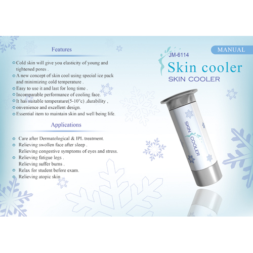 Trade Information:Portable Skin Cooler. Care after Dermatological & IPL treatment. Relieving swollen face after sleep. Relieving congestive symptoms of eyes and stress. Relieving fatigue legs. Relieving suffer bums. Relieving atopic skin . Professional and Durable. Good Quality, Beautiful Appearance, Attractive design. OEM and ODM service provided.